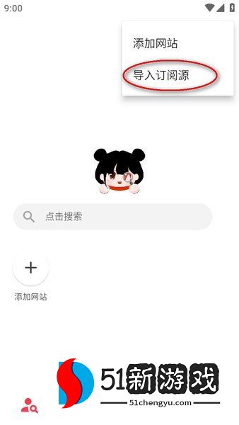 1、进入搜索应用后,点击右上角的三个点,选择“导入订阅源”。