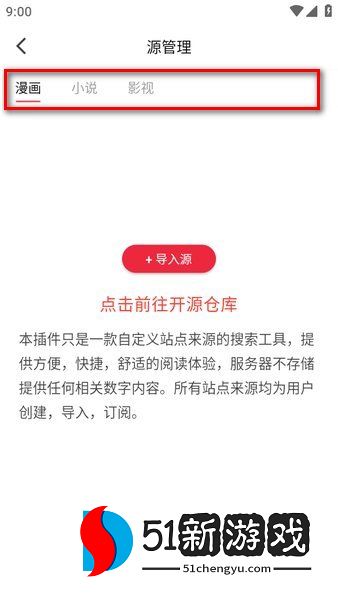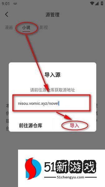 3、以“小说”为例,点击中间的“+导入来源”按钮,复制粘贴上面小说的来源地址,点击“导入”。