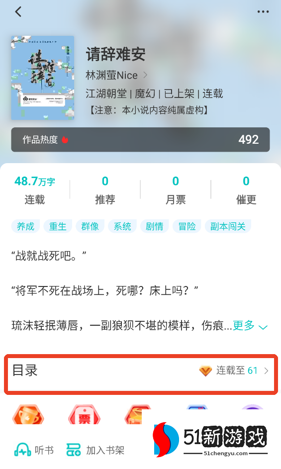 1、首先,我们将进入小说的详细界面,然后点击目录。