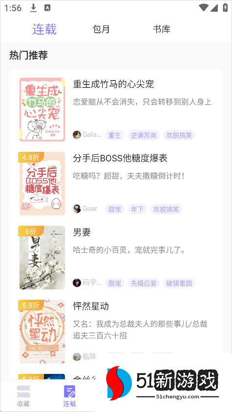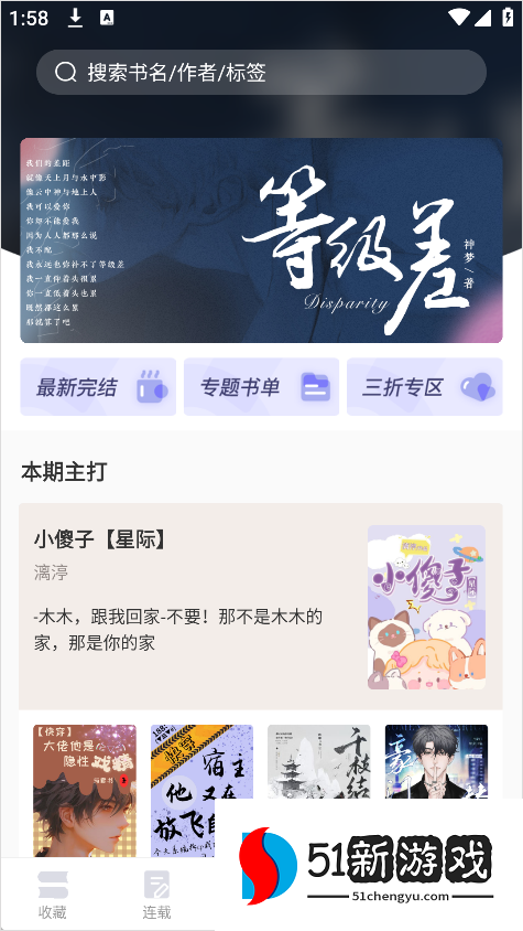 1、打开寒武纪年小说应用程序后,您可以在主页上看到五个主要部分:“收藏夹”、“续集”、“完成”、“免费”和“我的”,功能布局清晰简洁。