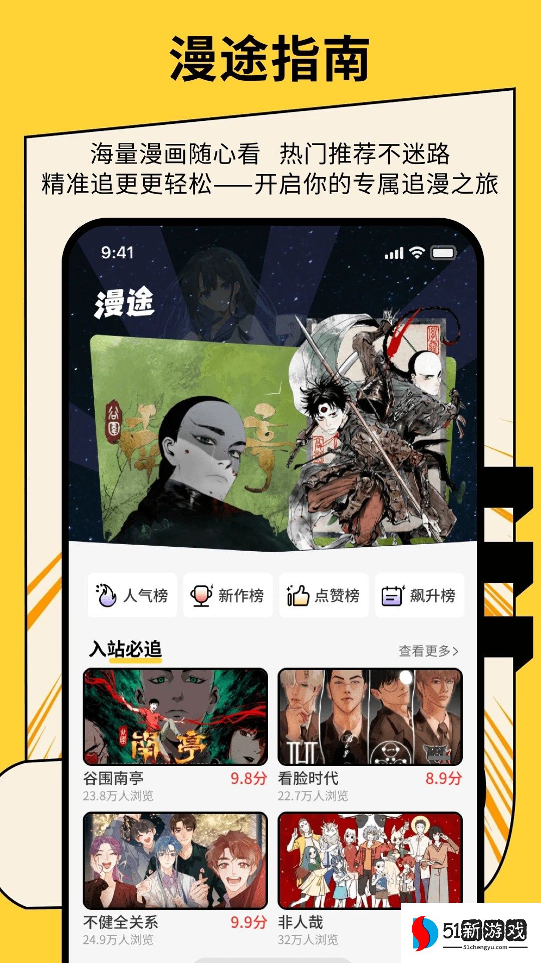 1、主页提供四大排名,包括人气图和新作品图,并有一个必读的选题。