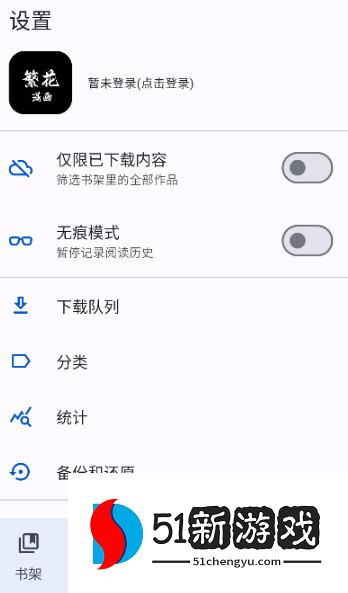 5、正版界面有五个栏目,分别是书架、更新、搜索、推荐、设置,请注意认准。
