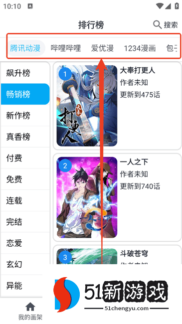 1、打开软件后进入首页,【搜索漫画】专题,在上方点击感兴趣的漫画来源。