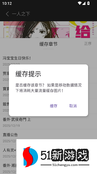 4、根据个人需求,选择好需要缓存的章节范围。确认后会弹出操作界面,请点击其中的【缓存】选项。