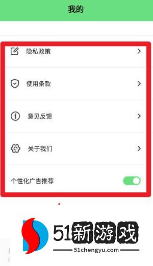 1、点击“我的”页面,可以查看隐私政策、使用条款和意见反馈,还能开启或关闭个性化广告。