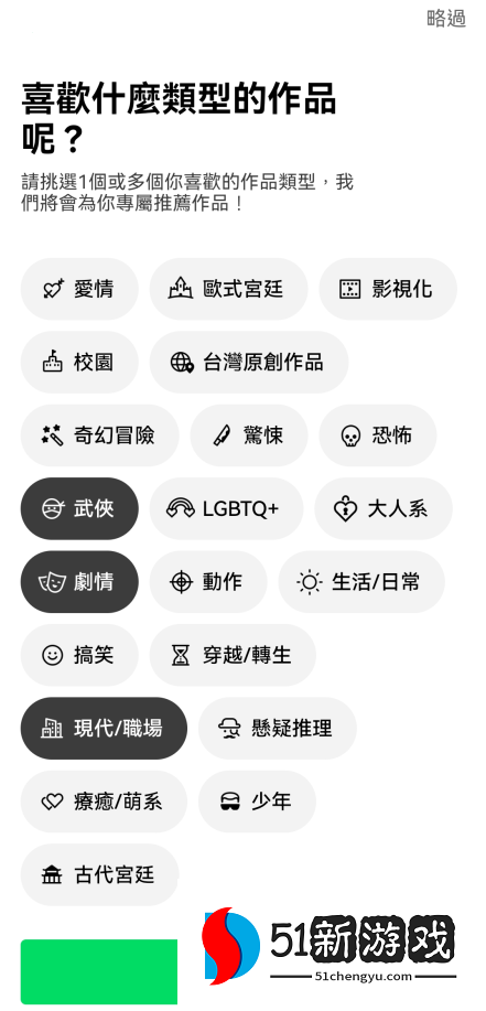 8、选择你喜欢的漫画类型,支持多选,选择完之后点击下方【完成】,也可点击右上角跳过。