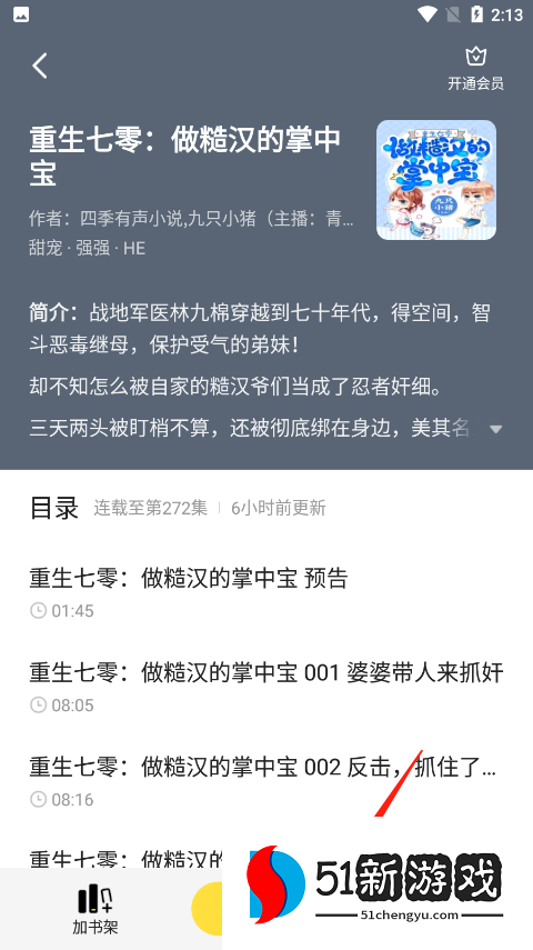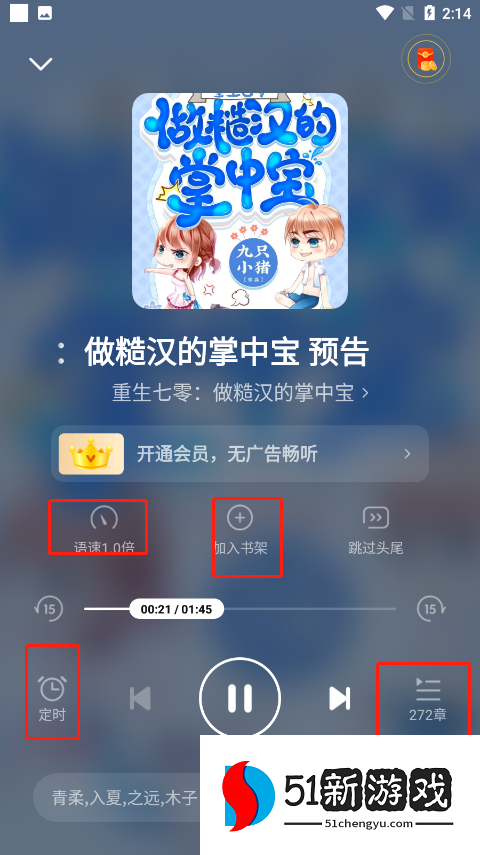 6、最后进行听书,这里可以任选一个章节听,还有给听书时间定时、调语速以及加入书架的功能。