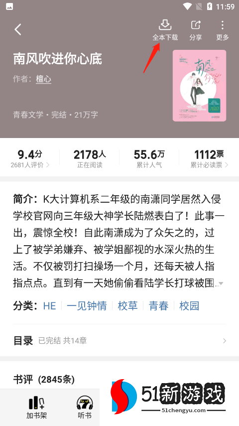 2、点击进入之后在页面的右下角点击免费下载,此时会提示你看完15-30秒的小视频即可免费下载本小说,点击右上角全本下载,看完小视频即可缓存成功了。