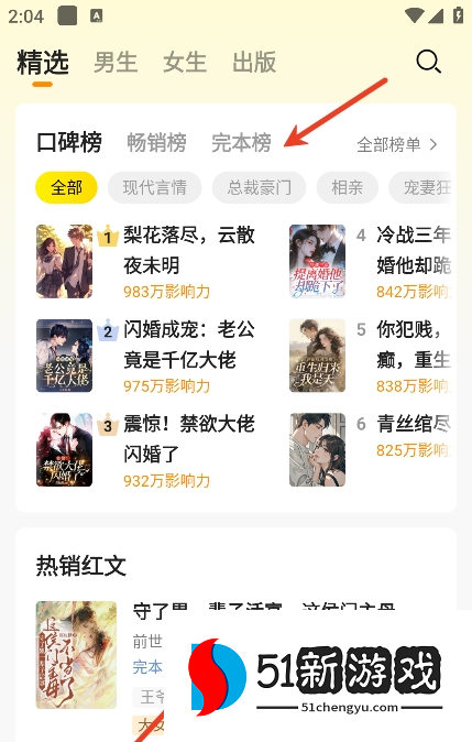 1、打开应用程序,用户可以根据小说排名列表选择他们最喜欢的小说,其中包括口碑列表、畅销书列表和完成列表。