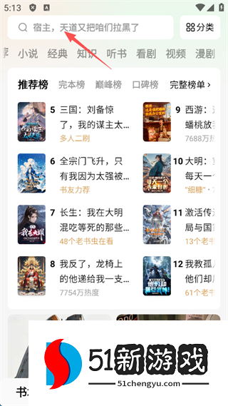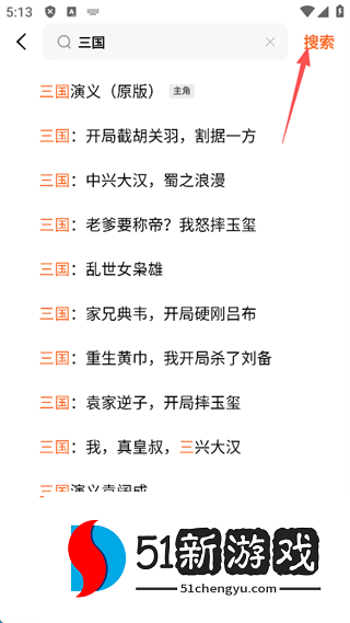 2、选择一个自己喜欢的题材小说,点击屏幕右上角的“搜索”。