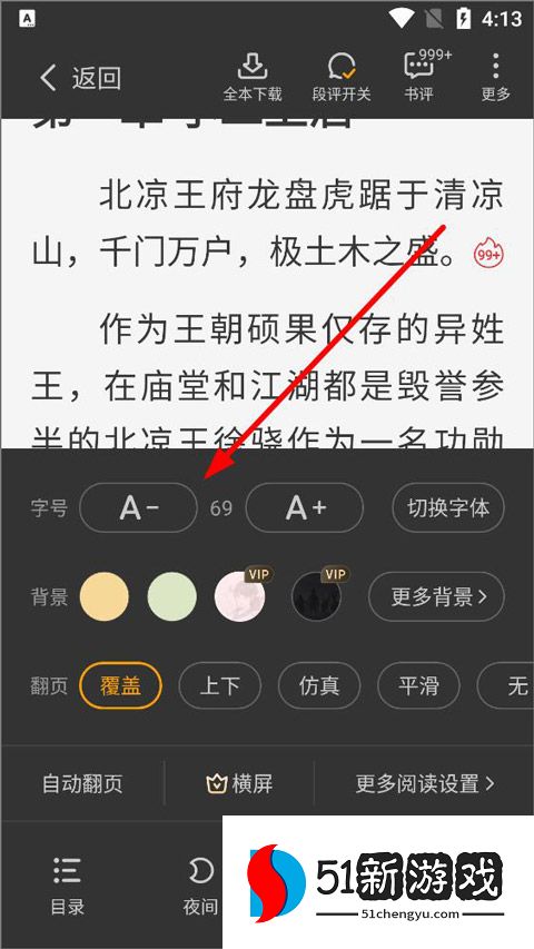 3、点击阅读页面显示功能键。用户可以下载整本书,查看书评、目录,设置夜间模式、亮度等。点击右下角的阅读设置。