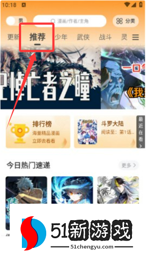 2、主页推荐部分显示各种选定的漫画,并有排名等栏目。