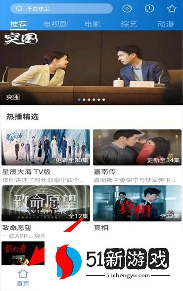 1、打开APP默认进入首页,在这里可以查看推荐的热播剧、电影、综艺等内容资源。