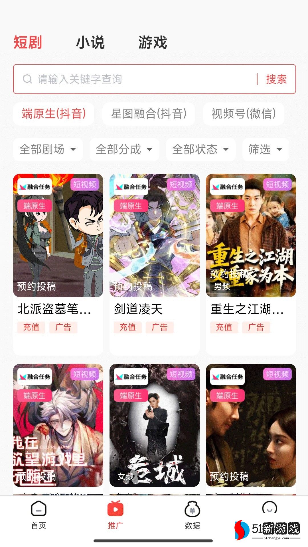 2、进入应用首页,实时关注最新热门短剧任务,方便选择和推广。
