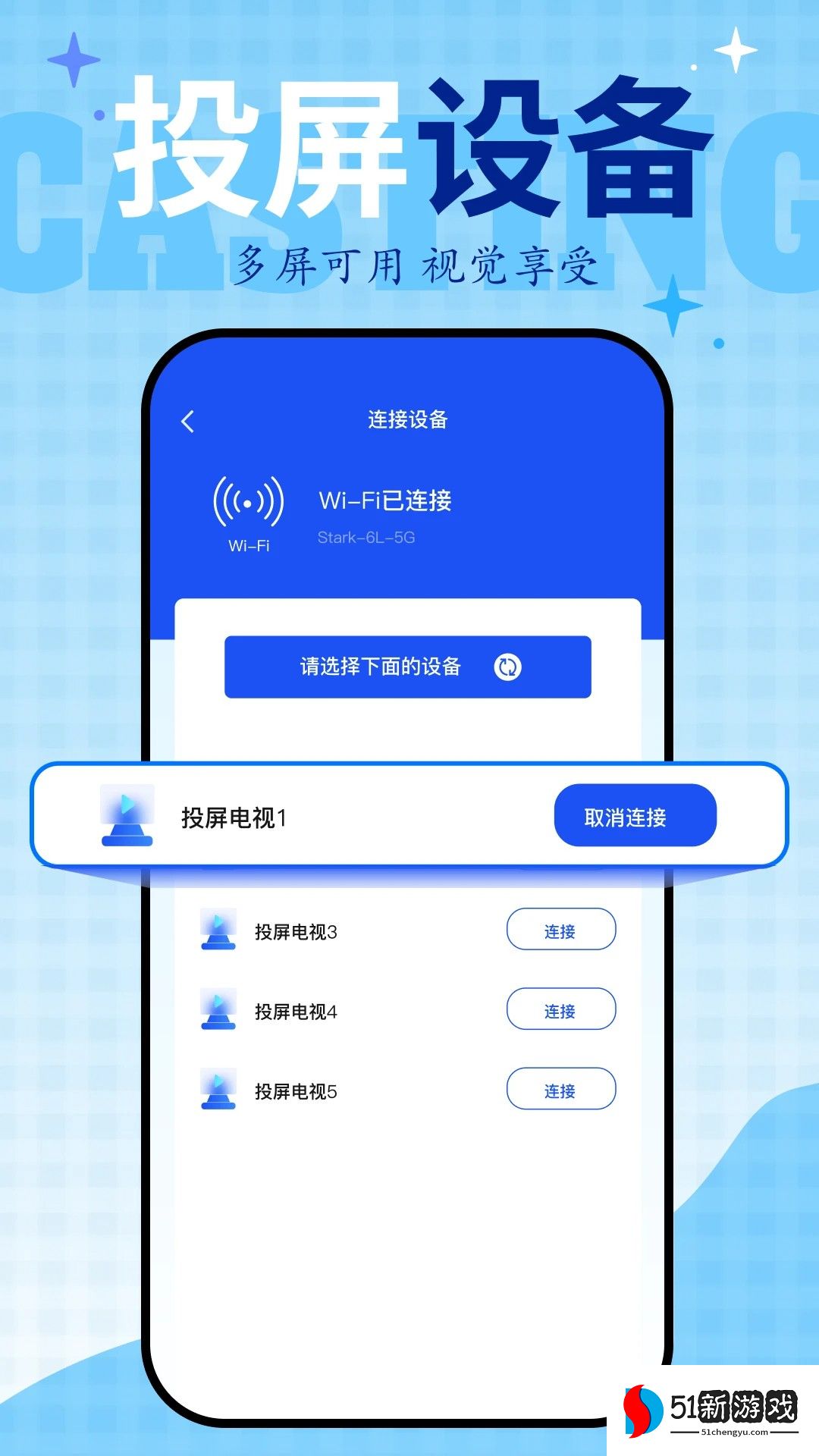3、电视的图标是屏幕投影功能。点击它将进入屏幕投影功能。在屏幕投影界面,将搜索同一wifi下的电视设备。一旦找到直接链接,就可以进行屏幕投影。