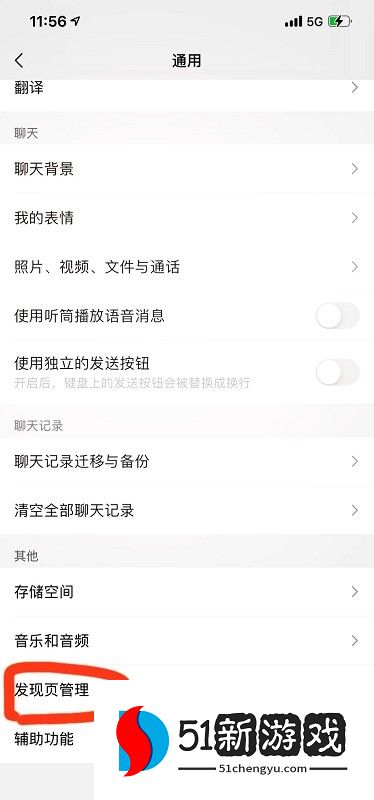 3、在通用设置中,向下滚动并点击“发现页管理”。