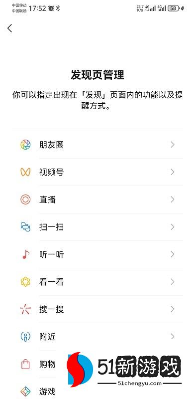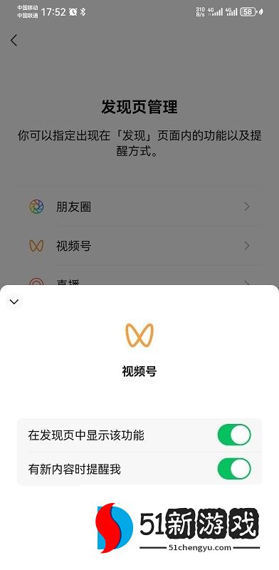 4、在发现页管理页面,你可以看到所有出现在“发现”页面的功能,找到并点击“视频号”。