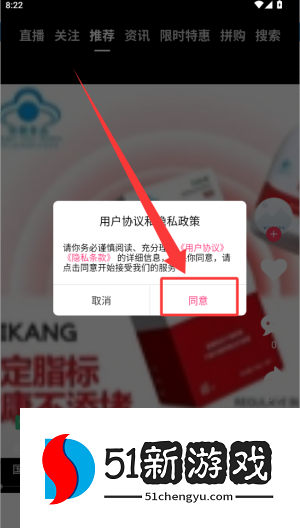 1、打开下载好的直播软件,点击同意进入软件首页。