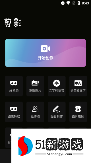 提供如提取图片、文字转语等强大功能外,还提供了图像特效、证件照、签名制作等实用功能,用户也可自定义自己的视频素材,随心创作。