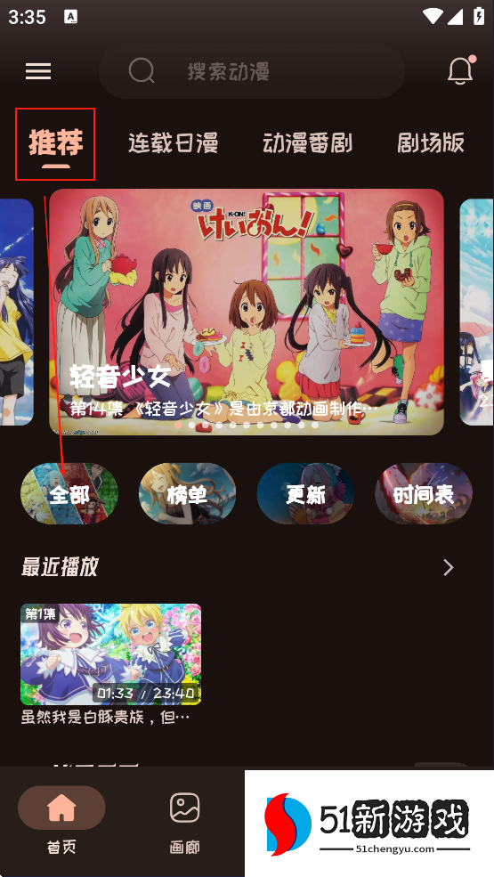 1、打开下载好的动漫软件,点击推荐,点击全部。