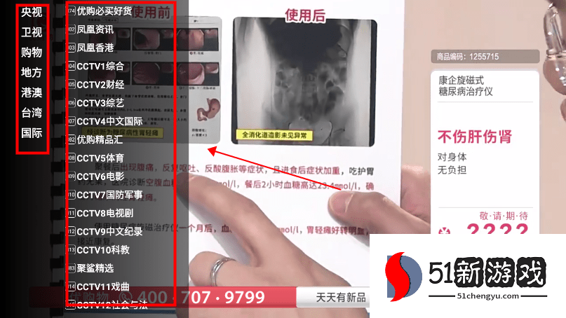 2、遥控器点确定,就能出现切换频道界面,有央视、卫视、购物、地方、港澳、台湾、国际等多个板块。