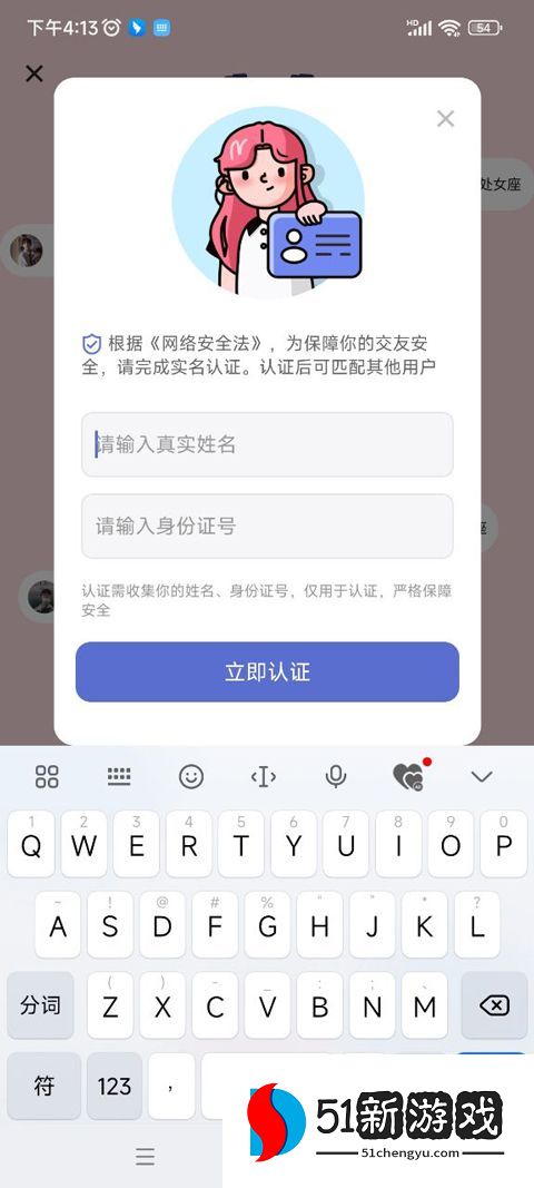 3、由于需要实名认证才可开启聊天,输入姓名和身份证号认证。