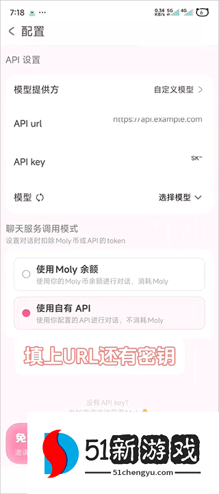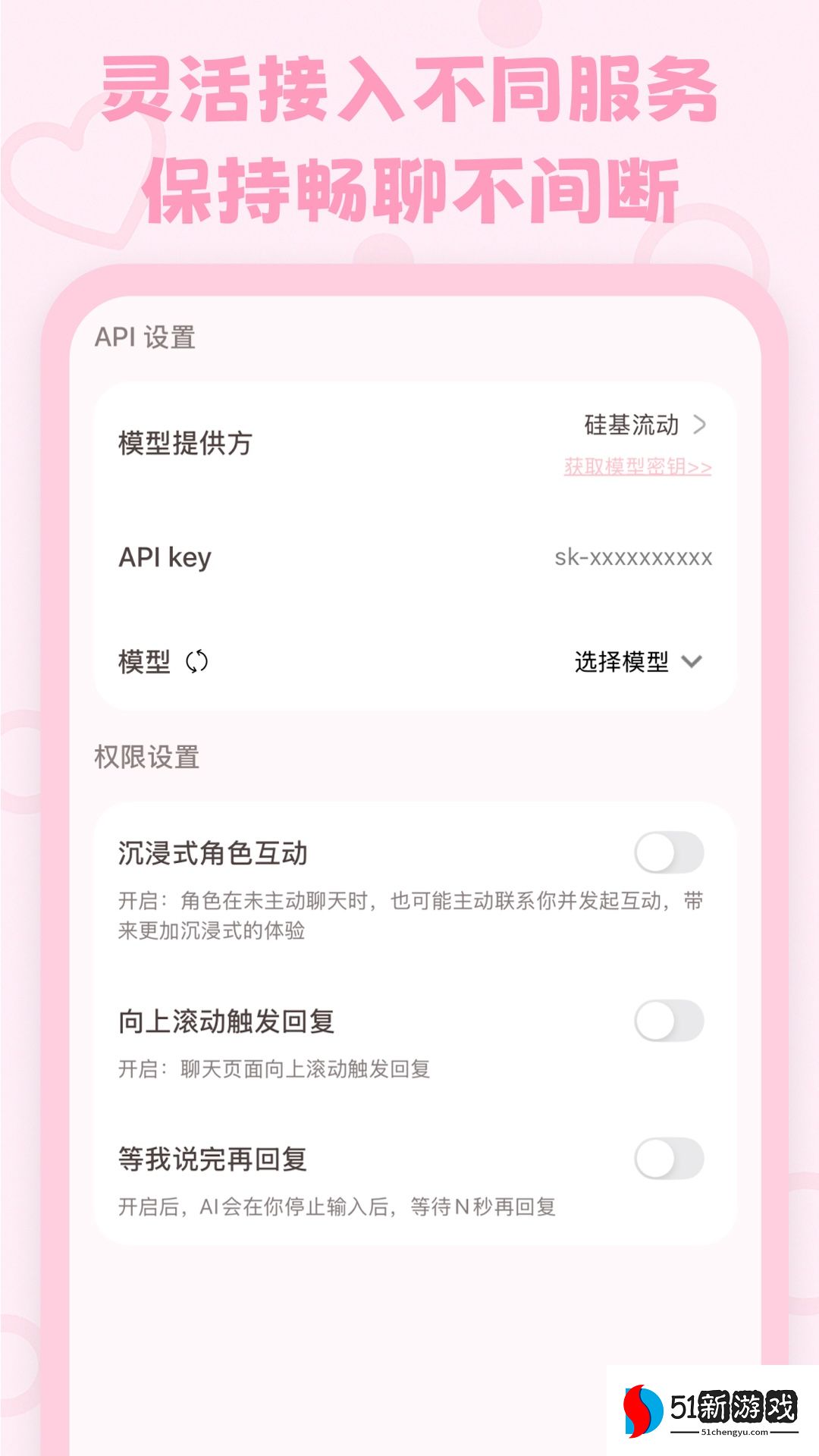 2、在设置页面中找到“API设置”选项,按照指引填写API及key,完成后保存,即可解锁聊天功能。