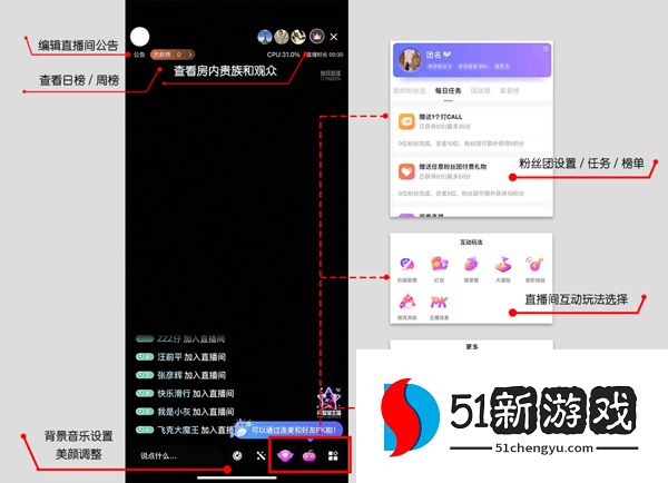 2、开播后可在主播直播界面查看直播相关信息和进行直播相关玩法。