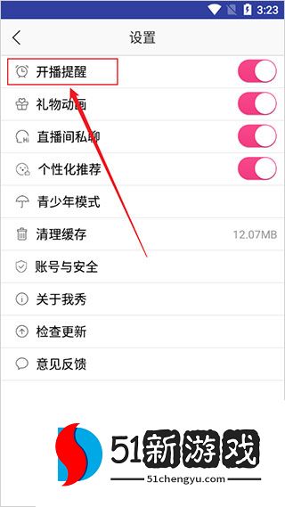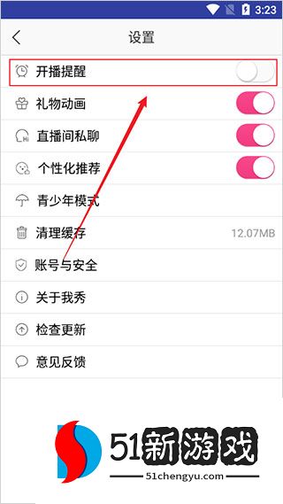 3、勾选“开播提醒”栏目右侧按钮,向左侧滑动进行关闭。