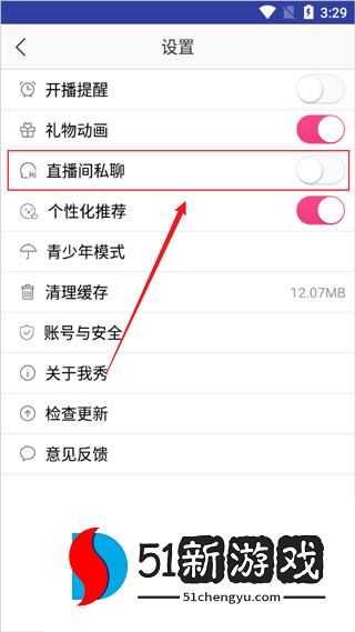 4、勾选“直播间私聊”栏目右侧按钮,向左侧滑动进行关闭。