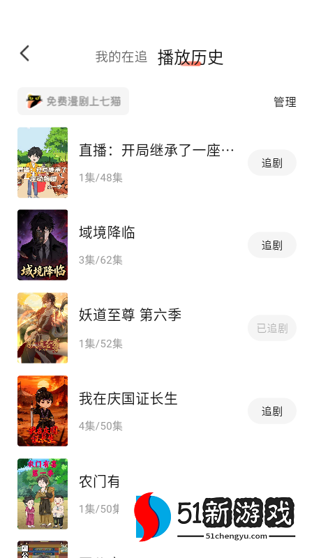 2、进入播放历史界面,点击右上角的【管理】
