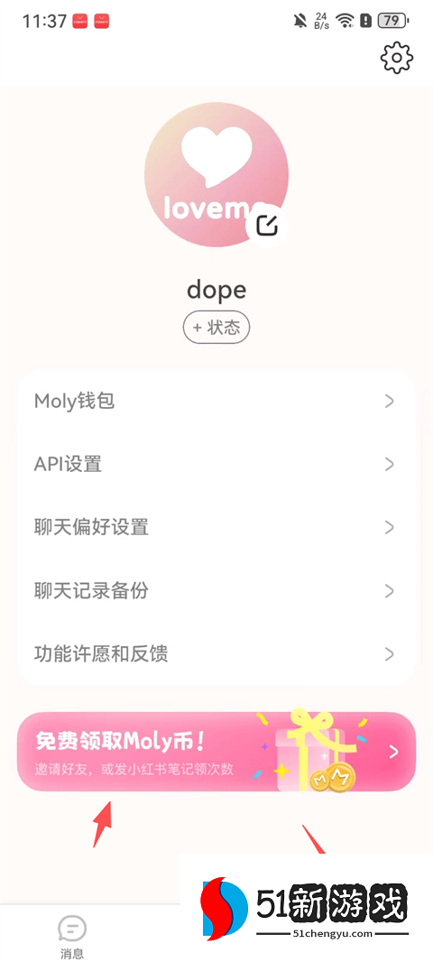 1、点击设置页的“免费领取Moly币”活动入口。