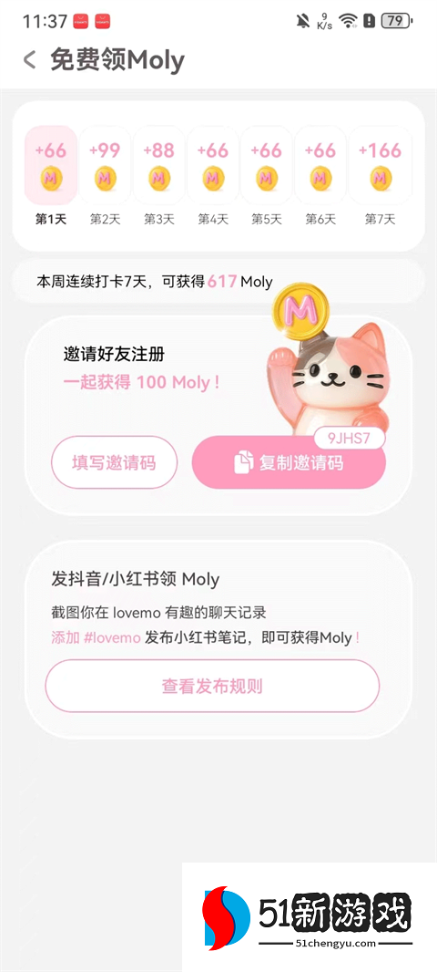 2、可通过邀请好友注册或将lovemo分享至抖音/小红书推广来免费获取Moly币。