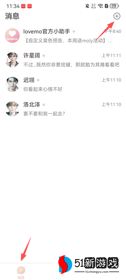 1、点击消息页右上角的”+“按钮。