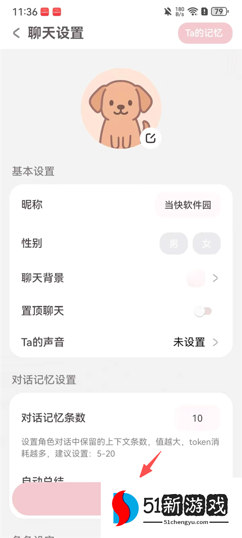 4、在聊天设置页还可以修改新人物的昵称性别声音以及对话设置等。