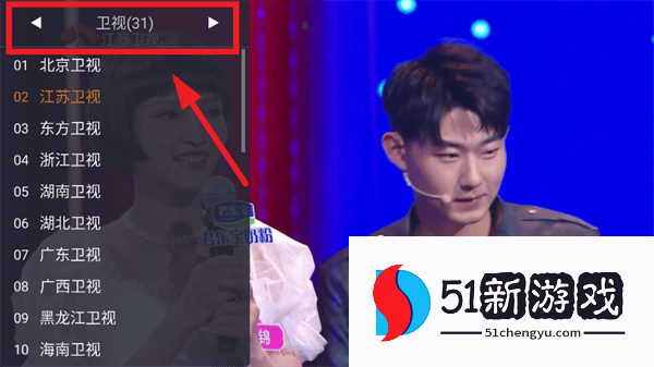 1、打开软件,进入播放全屏界面后,点击任意位置,在左边的弹框中点击如图所示的向右的箭头,就可以切换到卫视、以及各省市的地方台的分类。
