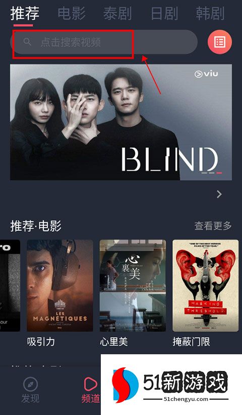 1、在“频道”页面上方的搜索框输入你想要搜索的剧名。