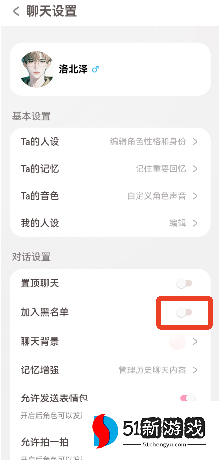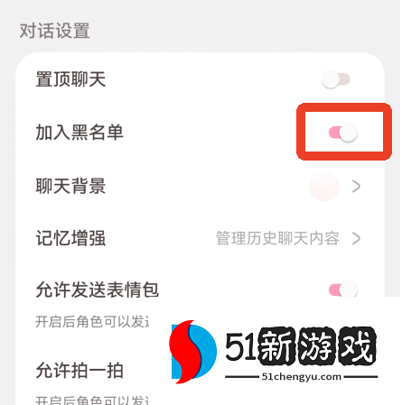 2、在对话设置下面找到【加入黑名单】,点击右边的滑块,会提醒你把角色加入黑名单后的一些注意事项,点击【确认加入黑名单】。