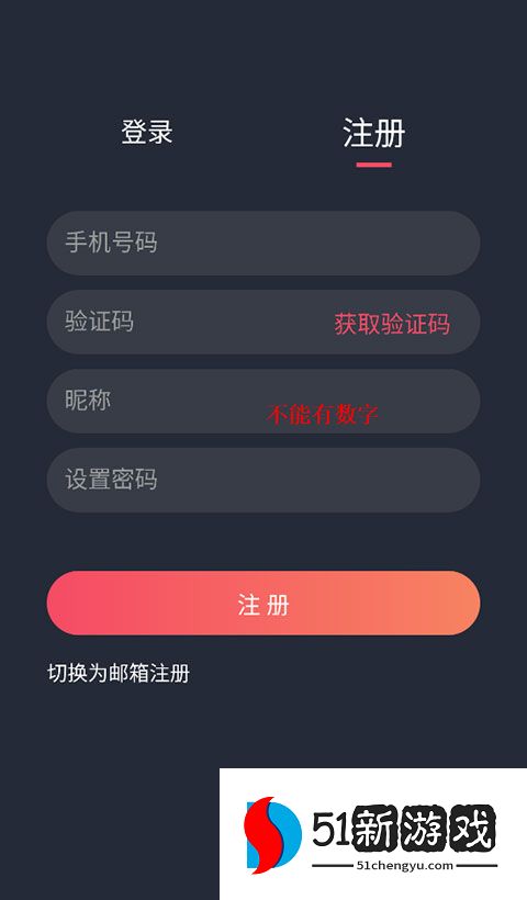 2、有账号密码直接登录即可,首次使用切换为“注册”,输入手机号、昵称以及密码。(注意:昵称里面不能有数字)