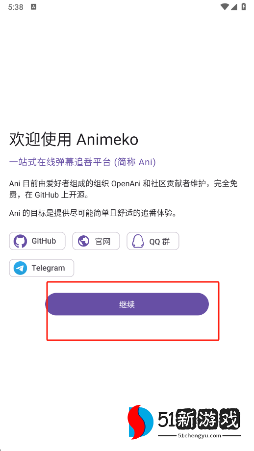 1、下载与安装:从提供的链接下载并安装Animeko,打开后点击继续。