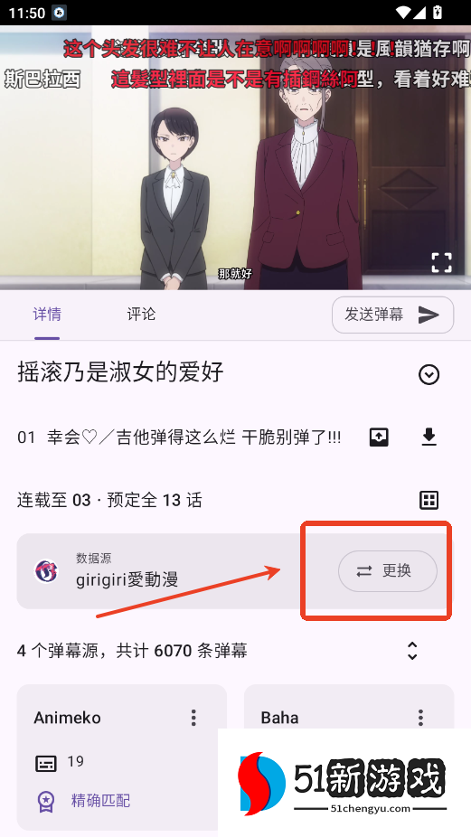 1、在观看番剧的页面,点击更换播放源按钮。