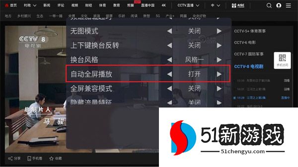 2、在设置中,将自动全屏播放打开