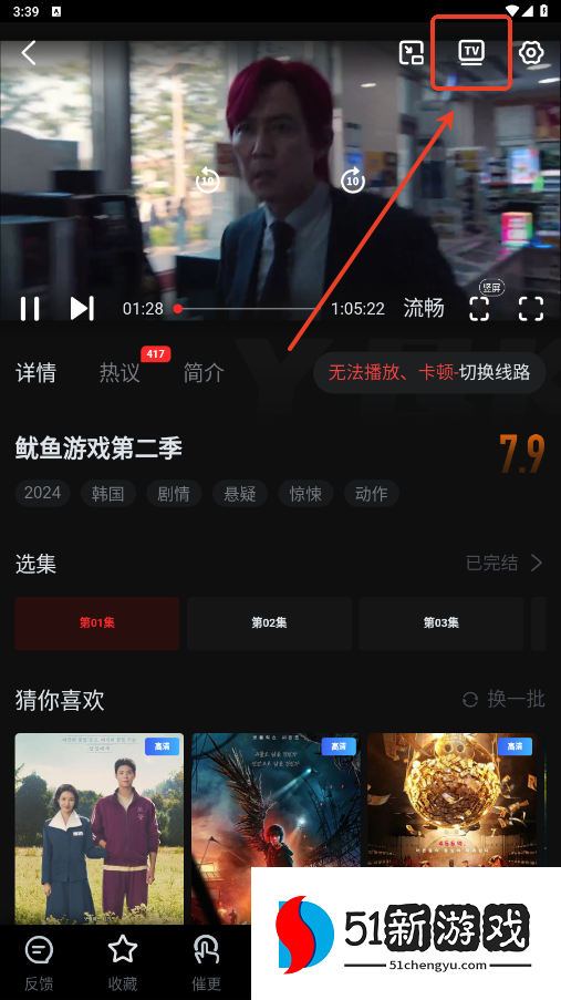 1、在软件上选择进入一部剧,点击右上角的TV按钮。