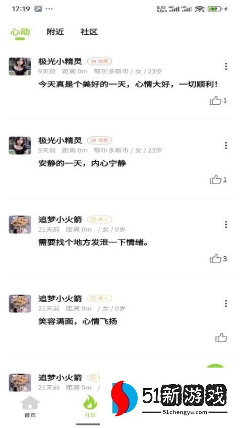 2、觅伴平台在线的人和社区动态自动刷新,方便用户随时查看新人与新鲜事。