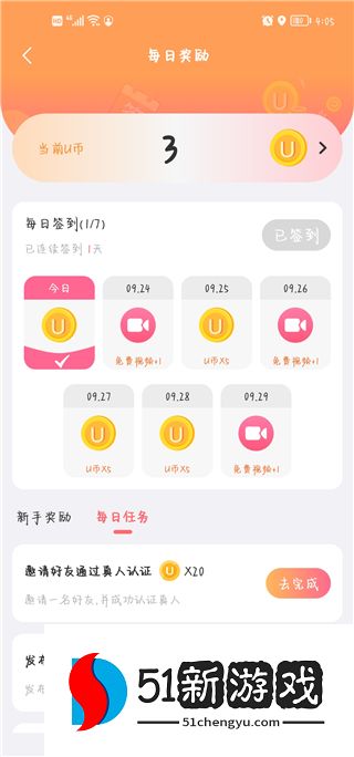 4、点击每日任务,用户还可以获得U币奖励。