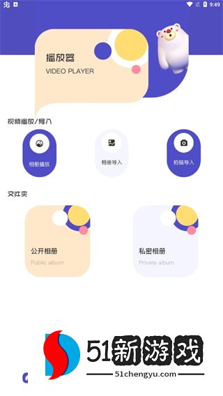 2、进入后,您将看到一个简单的界面,在主页上,您可以看到视频播放/导入和文件夹功能。这些功能可以有效地让您观看保存的视频并保护您的隐私。