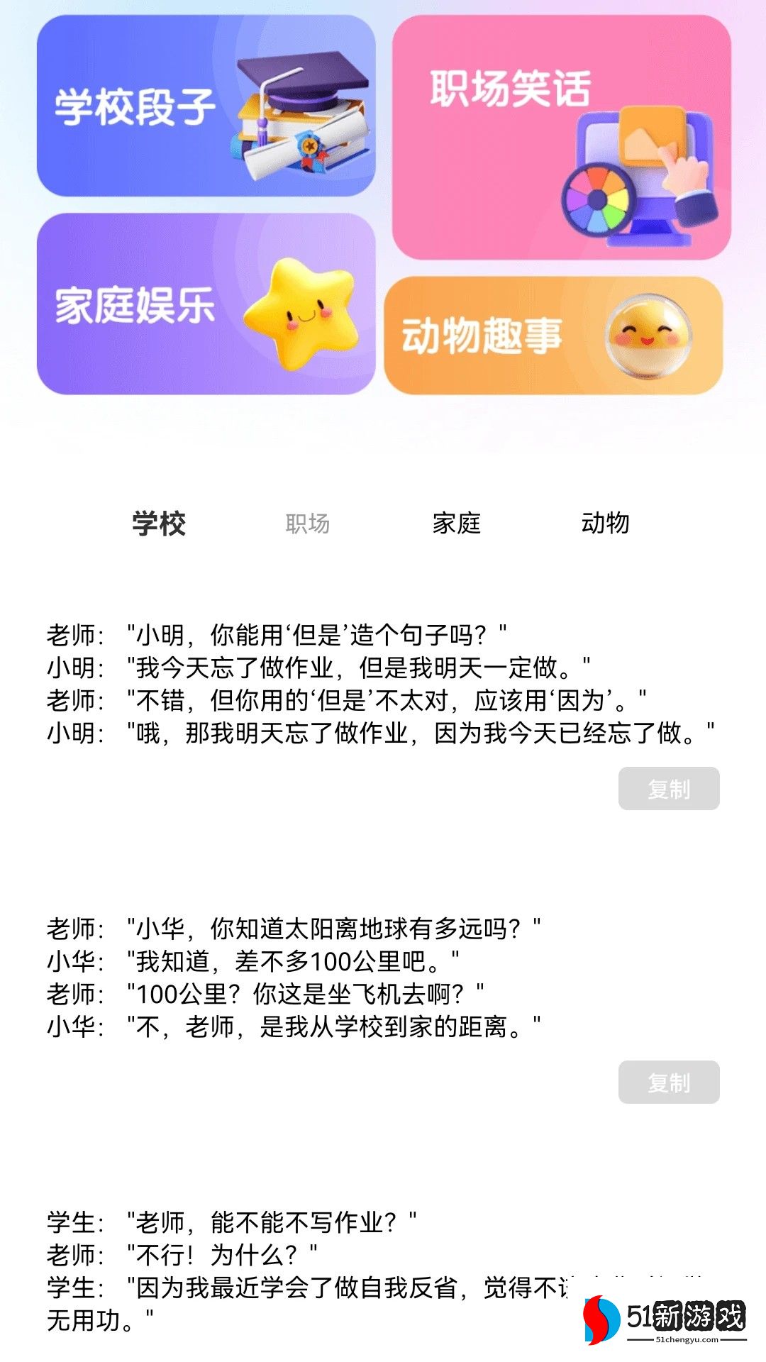 3、最后,在“轻松时刻”页面上,您还可以查看学习轶事、工作场所笑话、家庭娱乐和动物故事。