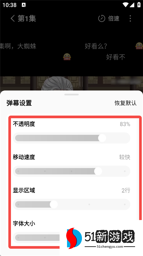 3、在此用户可以调节弹幕的透明毒、移动速度、显示区域等。