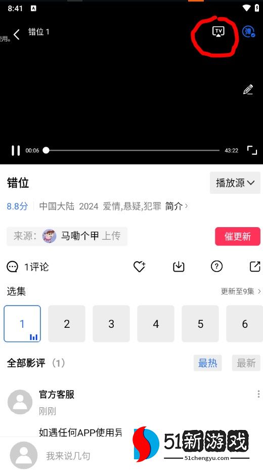 2、进入影视播放界面,点击TV投屏标志(图中红圈所标记位置)。