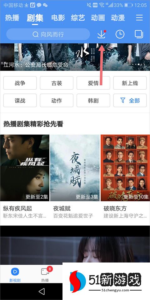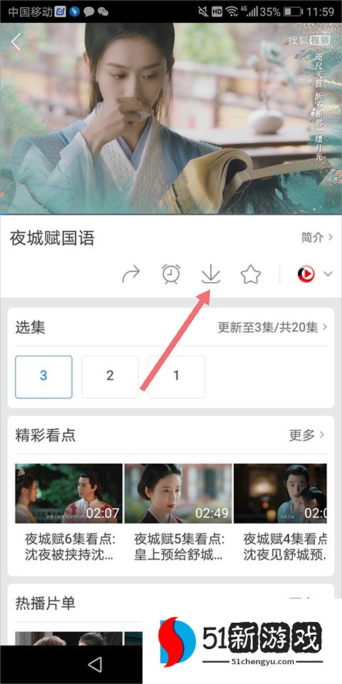 1、首先,用户点击电视剧播放页面上的下载图标(下图中红色箭头所示)。
